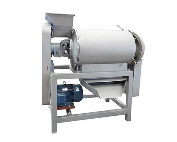 電機通過三角帶傳動,使安裝在花鍵軸上的刮板高速旋轉,當經過破碎的水果通過進料口進入機內時,擋漿盤將物料均勻排發到刮板和篩網之間,由於刮板的回轉作用和導程角的存在,使物料沿著園筒向出口端移動,移動的軌跡呈螺旋狀,物料就在刮板和篩網之間移動過程中受離心力的作用而被擦碎,汁液和肉質(已成漿狀)從篩孔通過進入下道工序(雙道打漿機為聯動重複上列過程),皮和籽等則從出渣鬥排出,從而達到自動分離的目的。隻要變換不同規格的篩網以及調整刮板導程角的大小,可改變不同的打漿速度,獲滿意的效果。